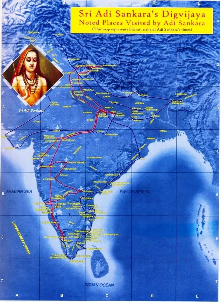 | आदि शंकराचार्य द्वारा भ्रमण के रास्ते |