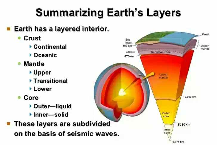 पृथ्वी की आंतरिक संरचना शल्कीय रूप में अर्थात प्याज के छिलको के समान परत रूप में हैं, इन परतों की मोटाई का सीमांकन रासायनिक एवं यांत्रिक विशेषताओं के आधार पर किया जा सकता हैं। पृथ्वी की मुख्य रूप से चार परत हैं। इसके सबसे अंदर इसका केंद्र हैं जो की क्रस्ट तथा मेटल से घिरा हुआ हैं, सबसे बाहर की परत भूपटल के रूप में हैं। पृथ्वी का आंतरिक कोर जो के लोह और निकेल से हैं, उसका अर्धव्यास १२२१ किलोमीटर हैं, इसका तापमान १०८३०°F अर्थात ६०००°C होता हैं। इसके ऊपर २२१० किलोमीटर मोटी परत हैं, जिसका निर्माण भी लोह तथा अन्य विभिन्न रसायनों से हुआ हैं, बाहरी कोर और क्रस्ट के बीच में मेटल वाली सबसे मोटी परत होती हैं। पृथ्वी का बाहरी कोर लगभग ३० किलोमीटर मोटा होता हैं।