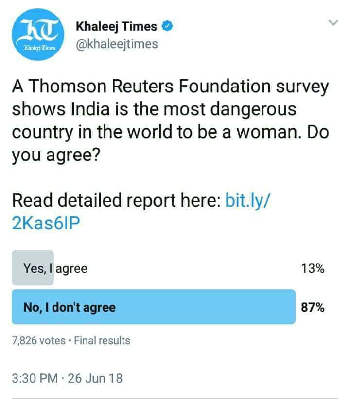 थॉम्पसन रॉयटर्स ने एक सर्वे किया है, जिसमे भारत को महिलाओं के लिए सबसे असुरक्षित देश बताया गया। अब चलिए इस सर्वे के सैम्पल साइज़ की बात करते हैं यानि की कितने लोगों ने इस सर्वे में भाग लिया? तो आपको बता दें कि 550 सेक्युलर, लिब्रल, इंटलेक्चुअल, प्रगतिशील महिलाओं ने सर्वे में भाग लिया और भारत में जहाँ 650000000 महिलाएं रहती हैं उनका कोई ओपिनियन लिए बिना इन 550 महिलाओं ने अपने एयरकंडीशन्ड कमरों में आरामदायक काउचों पर बैठकर वाइन सिप करते हुए 650000000 भारतीय महिलाओं की सहमति के बिना ही घोषित कर दिया की उनके अनुसार भारत महिलाओं के लिए विश्व में सबसे असुरक्षित है।