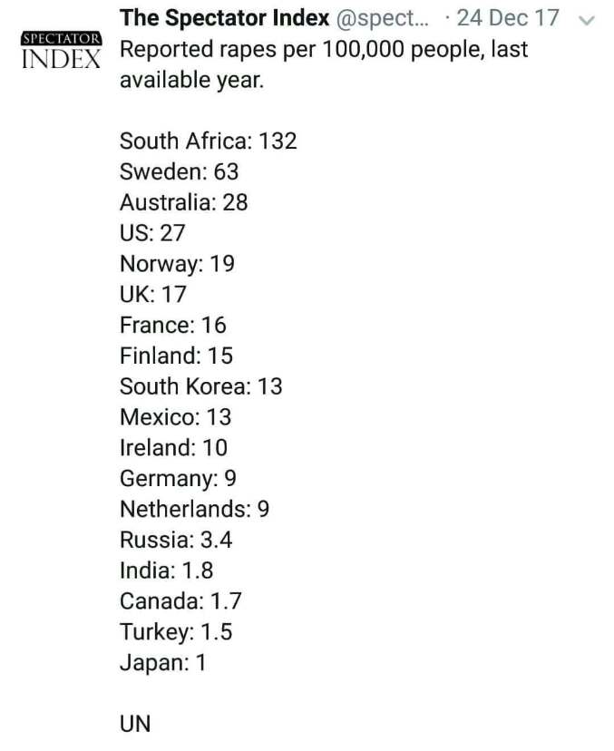 अब क्योंकि मैं तथ्यों व् आंकड़ों में विशवास करने वाला व्यक्ति हूँ तो UN द्वारा जारी किये आंकड़े प्रस्तुत कर रहा हूँ जिसमे विभिन्न देशों में प्रति एक लाख महिलाओं पर कितने रेप रिपोर्ट किये गए।
