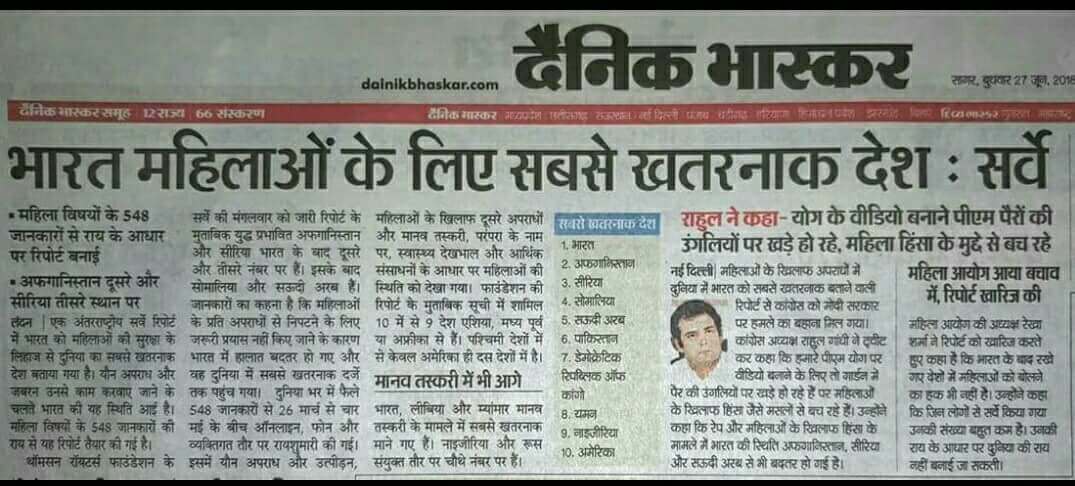 सर्वे रिपोर्ट पर राहुल गांधी हुलस कर सामने आए। तुरंत मोदी को गरिया दिया। ट्वीट करके योग वगैरह से जोड़ दिया। अब सभाओं में जिक्र होगा धूभधाम से। यह जाने बगैर कि 2011 में इसी फाउंडेशन ने ऐसी ही रिपोर्ट में भारत को महिलाओं के लिए दुनिया का चौथा सबसे खराब देश बताया था। तबके पीएम मौनी बाबा चुप रह गये थे। यह भी हैरत है कि अपना धंधा चमकाने आई एक कंपनी 61 करोड़ महिलाओं के देश पर सूचना का घातक अस्त्र चला कर उनकी छवि खराब कर रही है और महिलाएं चुप हैं। देश की महिलाओं को ही खुद आगे आकर इस फाउंडेशन को देश के बाहर खदेड़ देना चाहिए।