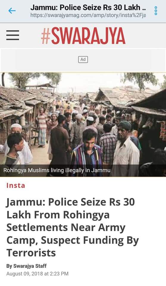 जम्मू के सुंजवान स्थित रोहिंग्या कैंप की जुग्गी झोपड़ियों से संचालित संदिग्ध हवाला रैकेट पर पुलिस ने छापा मारा और वहां ₹30,000,00 बरामद हुए। पुलिस की रेड शुरू होते ही आरोपी रोहिंग्या मुस्लिम भाग खड़े हुए, जिसमे बाद में 3 लोगों को हिरास्त में लिया गया। इस केस में हवाला के अलावा नारकोटिक्स ट्रेड की भी बात निकल कर आ रही है।