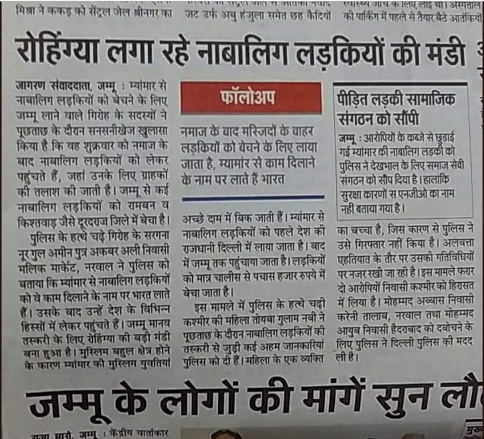 अभी कुछ दिन पूर्व खबर आयी थी कि रोहिंग्या मुस्लिम जम्मू में नमाज के बाद लड़कियों की मंडियां लगवाते हैं और नाबालिग लड़कियों को बेचा खरीदा जाता है और इसमें गिरफ्तारियां भी हुई थी। इसके अलावा जम्मू में रोहिंग्याओं के आने के बाद अपराध का ग्राफ बहुत तेजी से बढ़ा है।
