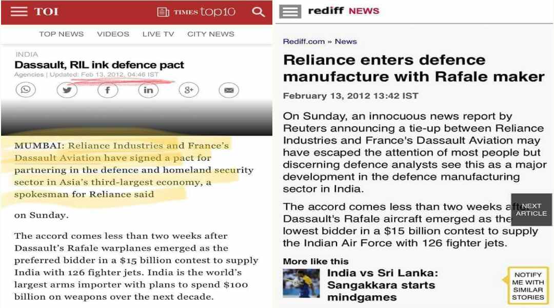 12 फरवरी 2012 को प्रकाशित रॉयटर्स रिपोर्ट के मुताबिक फ्रांसिसी रक्षा कंपनी डसॉल्ट को जैसे ही 15 बिलियन का राफेल कंट्रैक्ट मिलने की घोषणा हुई उसके ठीक दो सप्ताह बाद ही मुकेश अंबानी की रिलायंस कंपनी ने डसॉल्ट के साथ समझौता किया था। सवाल उठता है कि क्या इसके लिए उस समय तत्कालीन यूपीए सरकार को नियंत्रित करने वाली सोनिया गांधी या यूपीए सरकार की आलोचना की गई थी? जबकि ऑफसेट क्लॉज का अधिकार यूपीए सरकार के पास ही था। जबकि इस नए डील के तहत ऑफसेट क्लॉज का अधिकार बिडर कंपनी यानि डसॉल्ट के पास है। अब सवाल उठता है कि आखिर मोदी सरकार की आलोचना किस आधार पर की जा रही है? जबकि सारा किया हुआ यूपीए सरकार का है।