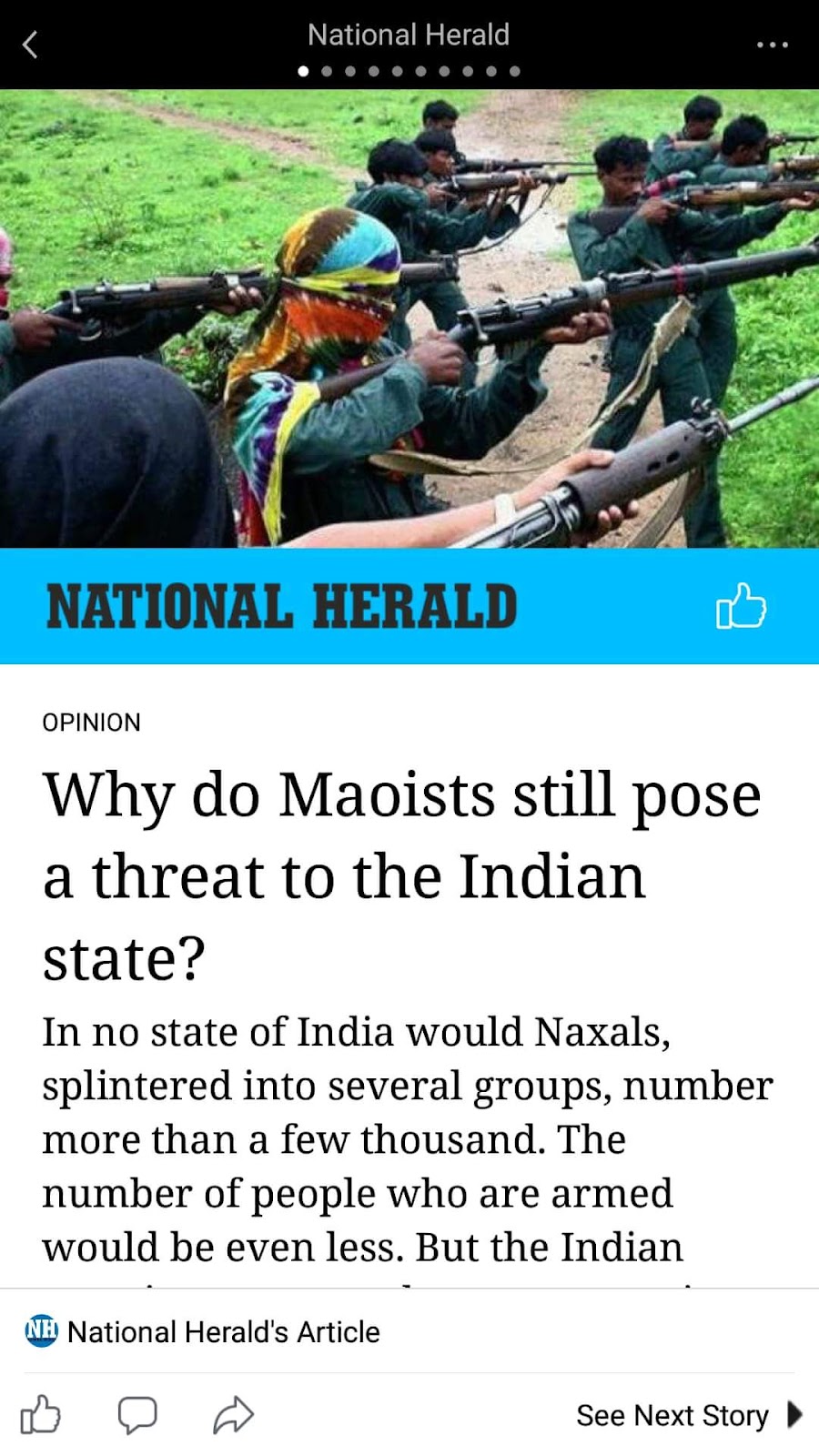 कांग्रेस के मुखपत्र नेशनल हेराल्ड ने एक लेख प्रकाशित किया है। जिस जिसका सार यह है कि “माओवादी आतंकी और नक्सली भारत के लिए कोई खतरा नहीं है, और बहुत ही कम माओवादी आतंकियों और नक्सलियों के पास उच्च क्षमता के हथियार है। और लेख के अनुसार भारतीय सुरक्षा बल कहीं अधिक शक्तिशाली हैं और सरकार जबरदस्ती इन माओवादी नक्सली आतंकियों से लड़ने पर इतना पैसा खर्च कर रही है, और यह माओवादी आतंकियों संग लड़ाई केवल मोदी नीत भाजपा सरकार का जनता को भ्रमित करने का प्रोपेगेंडा है।