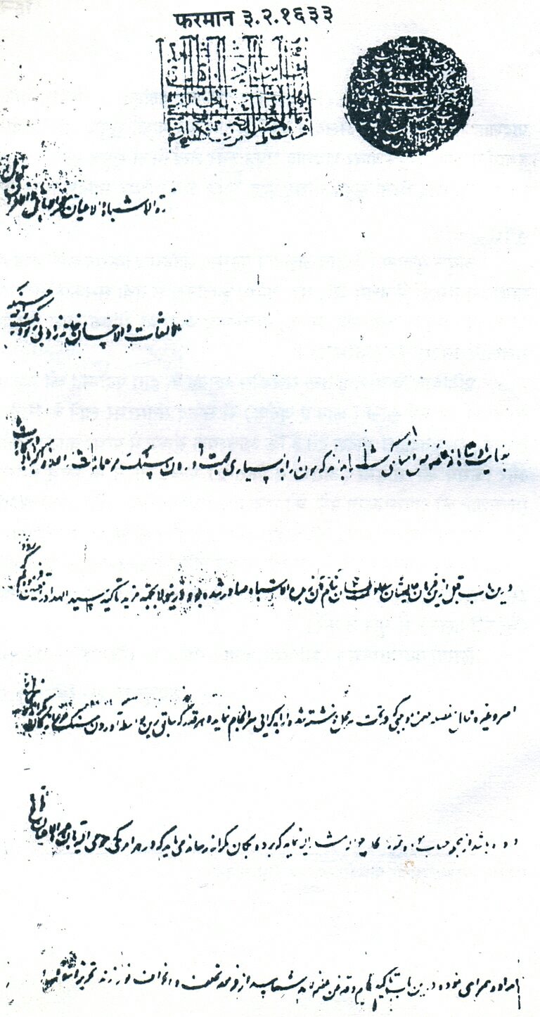 अबुल मुजफ्फर शिहाब अलदीन मुहम्मद साहिब ए किरान सानी शाहजहाँ पादशाह गाजी की समानों में उत्तम और भद्र, कुलीनता से गर्वित तथा समकालीनता का ध्यान देने योग्य एवं अनुग्रह का पात्र सच्चा, राजभक्त अनुरक्त सेवक राजा जयसिंह के नाम राजकीय आदेश-पत्र (फरमान)।